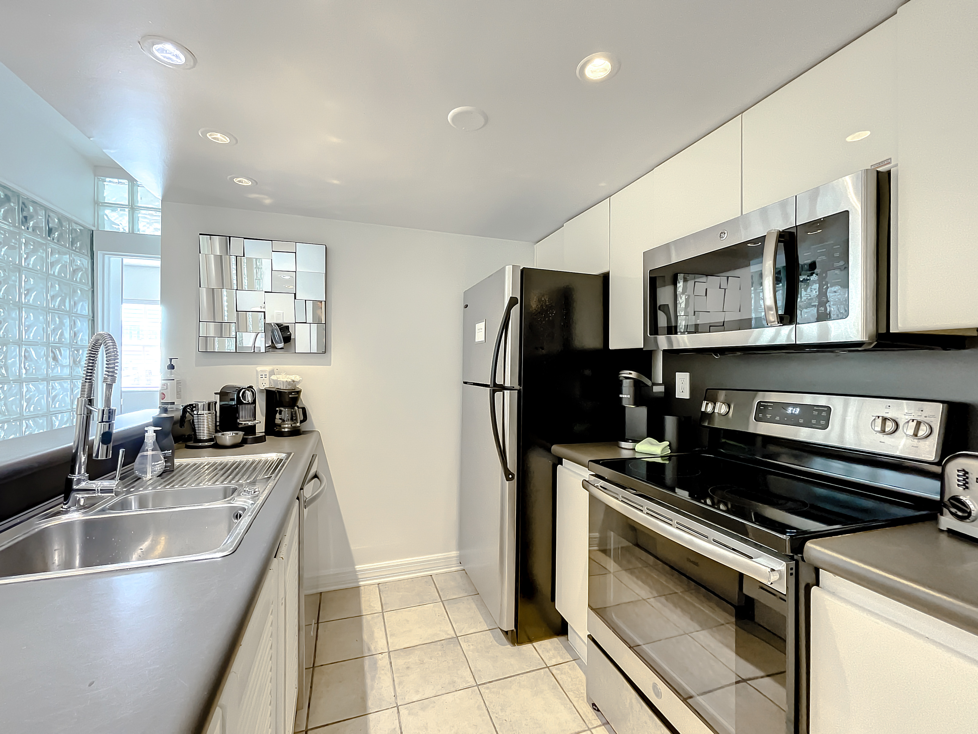 Fully Equipped Kitchen with an eat-in bar area: Fridge-Freezer, Oven, Stove, Dishwasher, Microwave, Coffeemaker, Toaster, Vitamix Blender, Nespresso and Keurig Cappuccino Latte Maker, Sodastream- Make Your Own Sparkling Water or Soda, Pots and Pans, Cooking and eating utensils, Ice Bucket & Wine and Champagne Glasses.